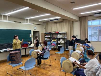 私も初めて少しだけ叩かせていただきましたが、腕を上げた状態で手首を使ってばちを動かすのがなかなかむずかしく、普段使っていない筋肉を使って腕が少ししんどくなりました。