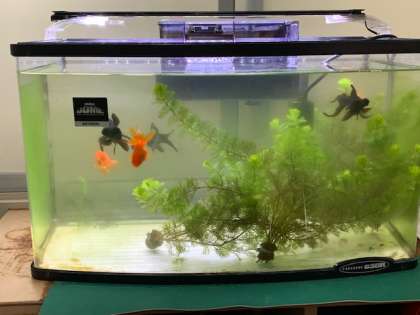 今年度は金魚が原因不明で亡くなったことが何度かありました。そこで、6月以降は生徒さんと協力して大事に育ててきました。そのかいもあり、少しずつ大きくなってきました。生徒さんは、金魚を育てるのはうまいですネ