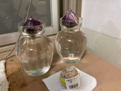 教頭先生が新しく、花の球根を金魚のとなりにおいてくださいました。