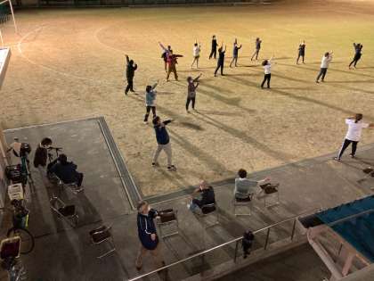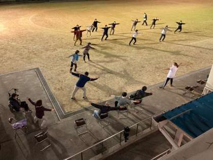 ウォーキング、ラジオ体操など広々とした運動場で、今年度初めての体育です!