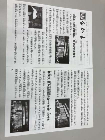 5月に開催された、生徒会連合会総会や新入生歓迎集会の様子が紹介されたニュース「なかま」が配られ、生徒部の先生から内容の紹介がありました。