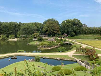 みんなで後楽園を見て回ります。日差しがきびしく、日傘や帽子の出番です。