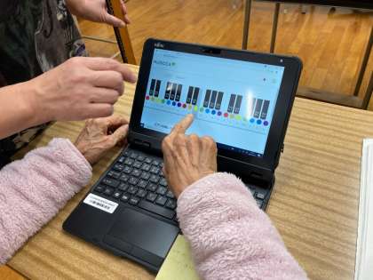 色付けされた鍵盤で分かりやすく、みなさんで「チューリップ」の曲で弾き語りにチャレンジされていました。