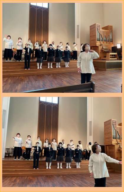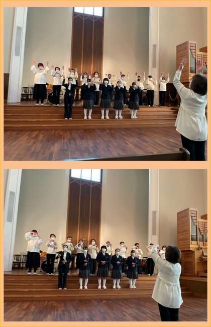 昼のコーラス部が「サザンカ」を歌った後、「ふるさと」、「切手のないおくりもの」の2曲を手話を交えながら、合同で歌いました。