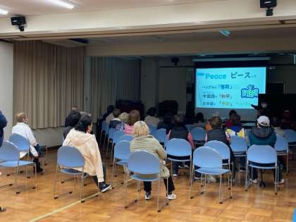 写真を映し出しながら展示の紹介があり、戦争を体験し盲目になられた方の動画も紹介され、一言ひとことがとても心に残ったと紹介されました。