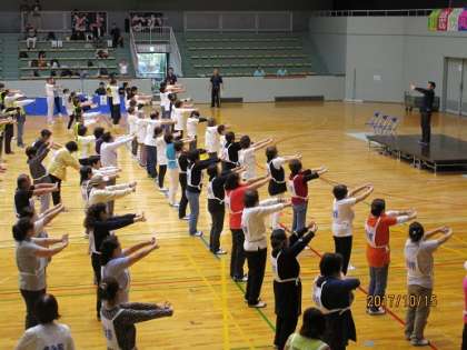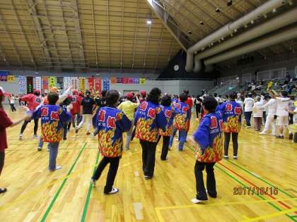 第44回 連合運動会が開催されました 公開日 2017/10/20 更新日 2017/10/20 お知らせ 夜間中学校3大行事の一つである連合運動会が今年10月15日(日)、豊中市の豊島体育館で開催されました。本校からは34人の生徒さんが参加。当日は、朝からあいにくの雨模様でしたが、競技が始まればその雨雲を吹き飛ばすような力強い演技を披露してくれました。特に、この日のために練習を重ねてきたよさこいソーランは、おそろいのハッピに身を包み、素晴らしい踊りを見せてくれました。 いいね(0)