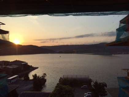 朝日が湖面を輝かせ、きれいでした。