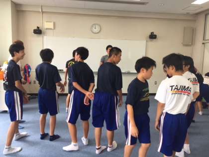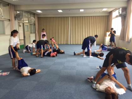 今日は雨のため、室内でストレッチ、体のケアについて顧問の先生に教えていただきました。