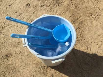 氷水をはって、冷たい水を浴び、熱中症対策をしています。