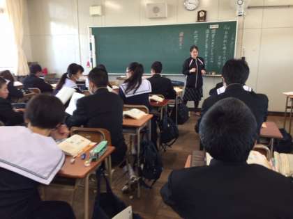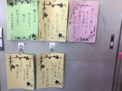 教室に木曜の百人一首大会に向けて、和歌のカードが掲示されています。
