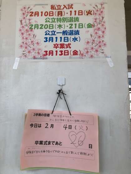 3年生の廊下に卒業までの日めくりカレンダーが掲示されています。
