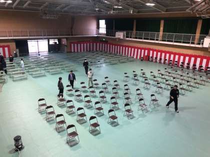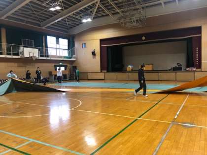 教職員でシートを張り、舞台とひな壇の設置をしました。