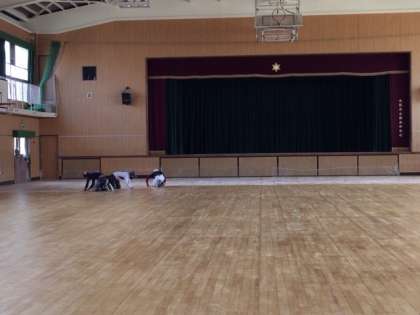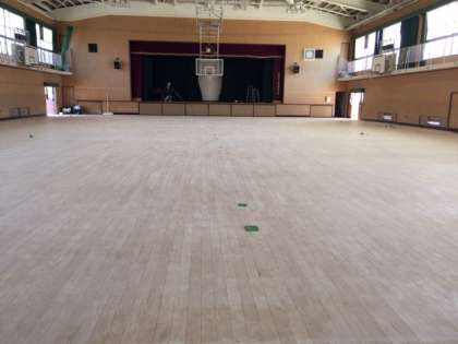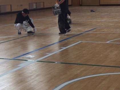 体育館の床が傷んでいたので、床の塗装を行っています。