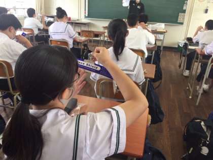 フェースシールドが配付され、それぞれ名前を書いて、管理の仕方の説明を受けました。