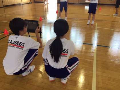 全体で練習したあと、グループに分かれ、タブレットで互いを撮影しました。