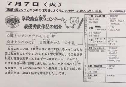 今日の給食は、「学校給食献立コンクール」最優秀賞作品をもとにつくられました。