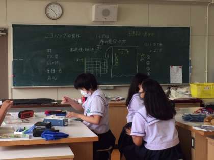 家庭科では、エコバッグの制作をしています。