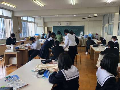 1年生の家庭科では、トートバッグ作りをしています。ポケットを付けていました。みんな真剣に取り組んでいました。