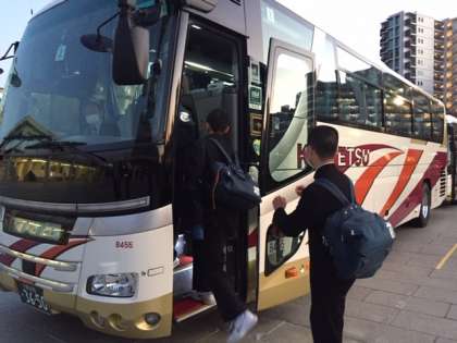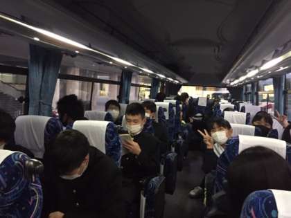 バスに乗って、今から宮島の宿舎に向かいます。