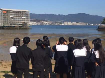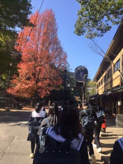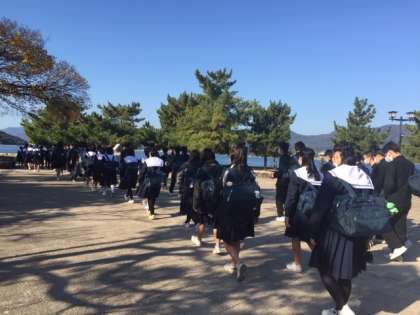 クラス写真を撮り、これから宮島水族館に向かいます。