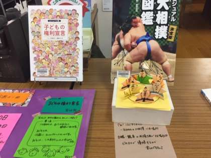 図書館補助員さんが素敵な掲示物をつくってくださっています。