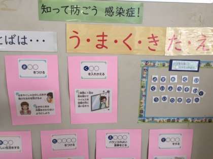 保健室前には、「知って防ごう!感染症」の掲示物が貼られています。