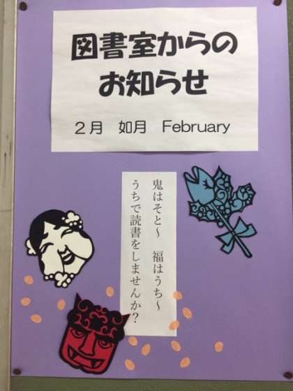 毎月の図書室からのお知らせを図書館補助員さんが工夫を凝らして作成してくださっています。