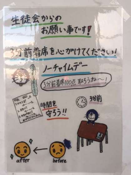 みなさん、ノーチャイムデイの授業3分前着席の声かけに協力していただきありがとうございました。