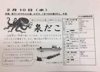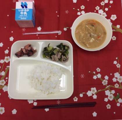 今日のメニューは、「米飯、泉だこの柔らか煮、みそ汁、こまつなの煮びたし、牛乳」でした。