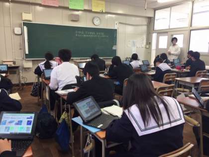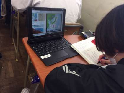 社会科の授業では、タブレットを活用し調べたことをプリントに記入しています。