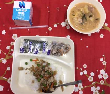 今日のメニューは、「鶏ごぼうご飯、みそ汁、焼きれんこん、牛乳」でした。