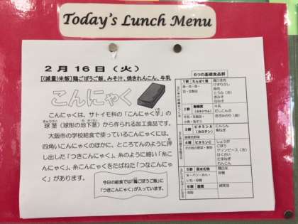 今日の給食では、「鶏ごぼうご飯」に「つきこんにゃく」が入っていました。