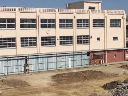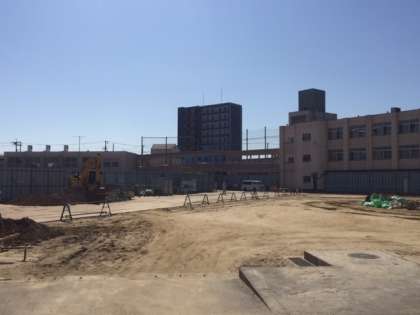 仮囲いの中では、校舎建築の工事が始められるよう準備がすすめられています。