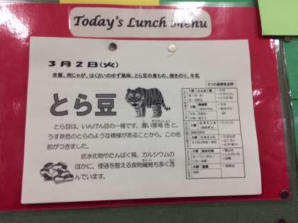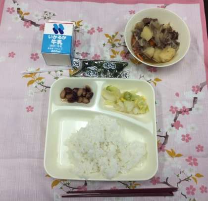 今日の給食は、「米飯、肉じゃが、はくさいのゆず風味、とら豆の煮もの、焼きのり、牛乳」でした。