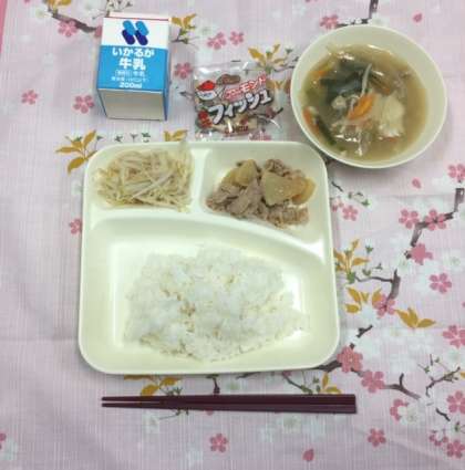 今日のメニューは、「米飯、豚肉のコチジャンいため、トック、もやしのナムル、アーモンドフィッシュ、牛乳」でした。