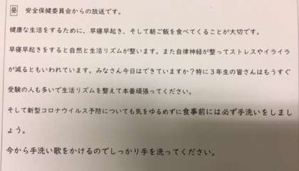 安全保健委員会の人が、「手洗い歌」と感染防止、体調管理についてお話をしてくれています。