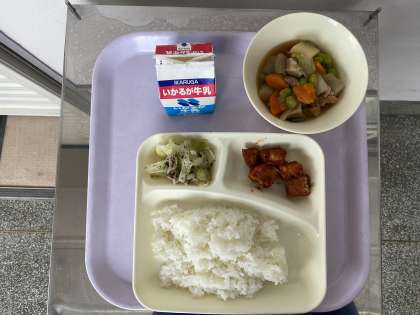 今日のメニューは、マグロのオーロラ煮、含め煮、キャベツの赤じそあえ、ご飯、牛乳でした。