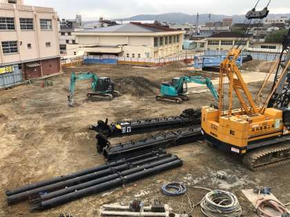 校舎増築の基礎になる杭打ち工事が完了し、大きな重機が解体されていっています。