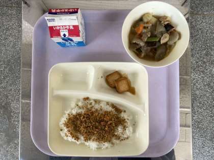 今日のメニューは、鶏肉のじゃがいもの煮もの、あつあげのしょうゆだれかけ、紅ざけそぼろ、ごはん、牛乳でした。