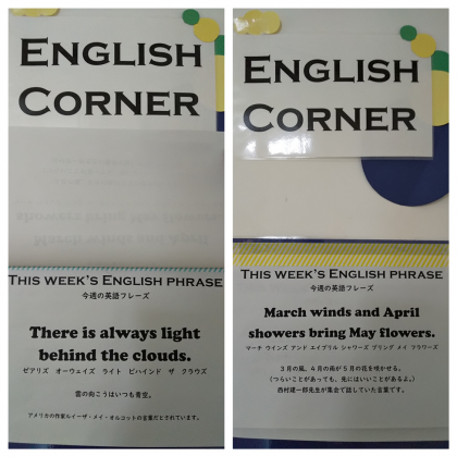 2年生の廊下にある『ENGLISH CORNER』という掲示物では、「今週のフレーズ」を紹介しています。