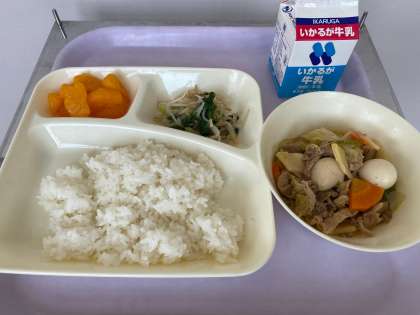 今日のメニューは、八宝菜、チンゲンサイともやしのしょうがあえ、みかん(缶)、ご飯、牛乳でした。