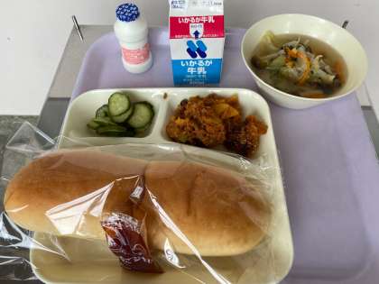 今日のメニューは、じゃがいものミートグラタン、スープ、きゅうりのバジル風味サラダ、発酵乳、コッぺパン、牛乳でした。