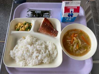 今日のメニューは、あかうおのしょうゆだれかけ、みそ汁、えんどうの卵とじ、焼きのり、ご飯、牛乳でした。