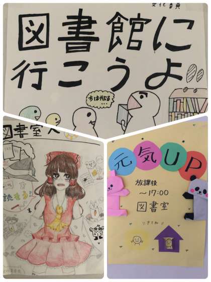 校内に図書館へ行きたくなるようなポスターがたくさん貼っています。