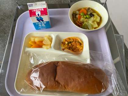 今日のメニューは、2年生は、豚肉と野菜のカレースープ煮、変わりピザ、ミックスフルーツ(缶)、黒糖パン、牛乳でした。
