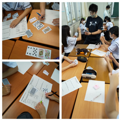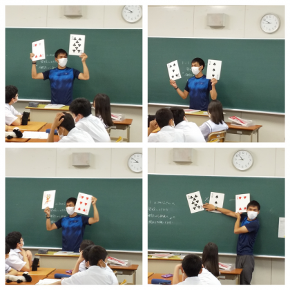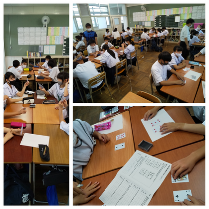 トランプゲームをしながら正負の数の計算を発見的にとらえる学習をしました。前回の「加法・減法」に続いて、今回は「乗法」にチャレンジしました。