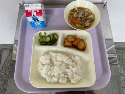 今日のメニューは、中華煮、あつあげのピリ辛じょうゆかけ、きゅうりの中華あえ、ごはん、牛乳でした。