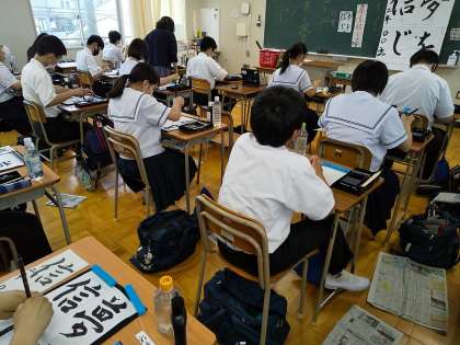 黒板の手本で、「書き方の原理・原則」を確認した後、実技に進みます。