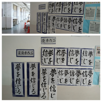 廊下の掲示は、「授業中の話(書き方の原理・原則)を聴いて、表現しようとしているか」「積極的に取り組んだか」を評価して、その都度更新していきます。