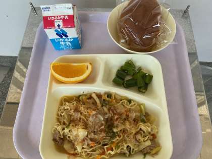 今日のメニューは、和風焼きそば、オクラの甘酢あえ、オレンジ、パン(1/2)、牛乳でした。